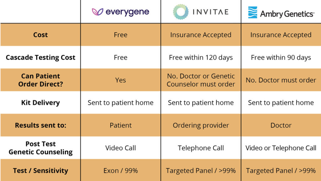 See the Complete Testing Comparison Chart to learn more about the details around Ambry, Everygene and the Invitae tests.